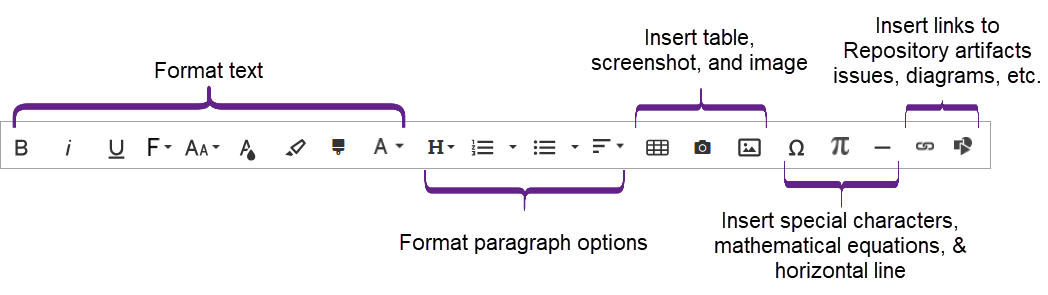 Rich Text Editor is used in various fields across record types such as Use Cases, User Stories, Requirements, and more. Fields like Description, Acceptance Criteria, etc., support rich formatting and allow to insert content such as tables, images, links, and diagrams.