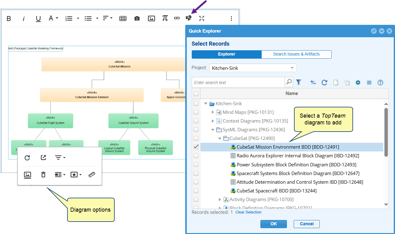 Ideal for quickly referencing related Use Cases, Requirements, or Design elements from within text. |